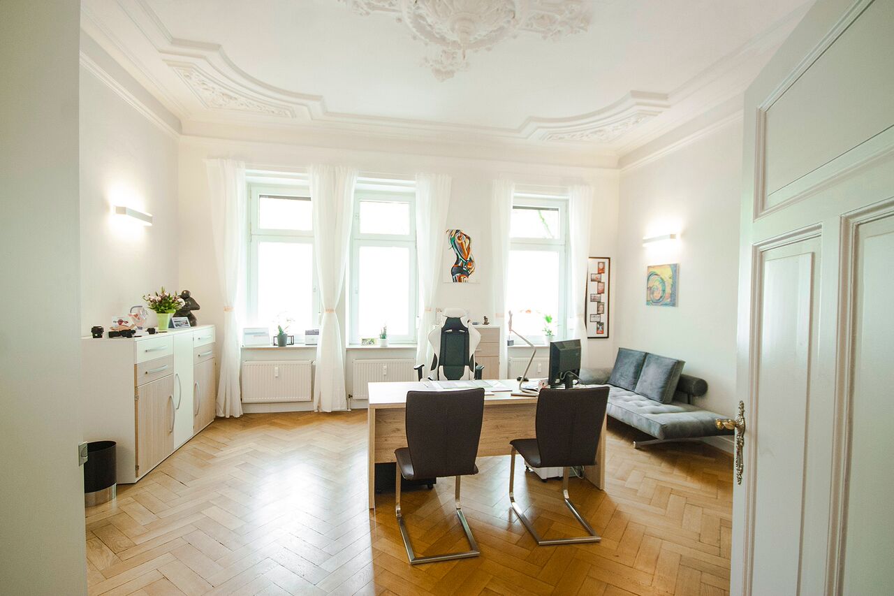 Der Charme der "Gründerzeit" sowie moderne Innenarchitektur, gepaart mit modernen künstlerischen Akzenten, bietet den idealen Rahmen für Gespräch und Behandlung.
